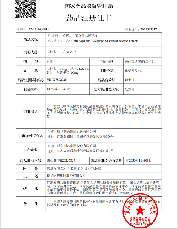 2025年11月10日,精华制药集团股份有限公司收到国家药品监督管理局核准签发的卡左双多巴缓释片的两个《药品注册证书》;其中大规格产品(卡比多巴50mg/左旋多巴200mg)为国内第三家获批企业,而小规格产品(卡比多巴25mg/左旋多巴100mg)则为国内首仿企业且该规格原研产品没有…