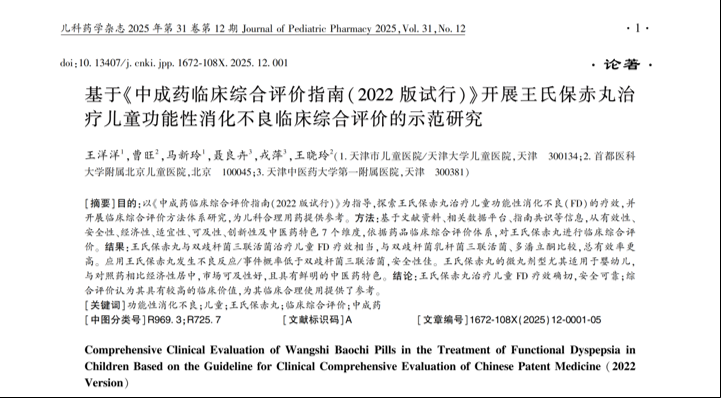 2025年12月10日,精华制药集团的核心产品——王氏保赤丸的临床综合评价研究论文《基于〈中成药临床综合评价指南(2022版试行)〉开展王氏保赤丸治疗儿童功能性消化不良临床综合评价的示范研究》,正式发表于《儿科药学杂志》2025年12月第31卷第12期。该研究由首都医科大学附属北…